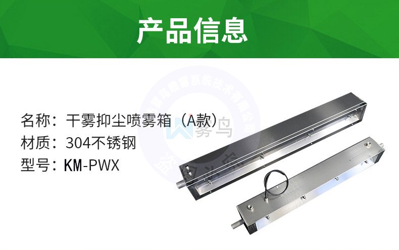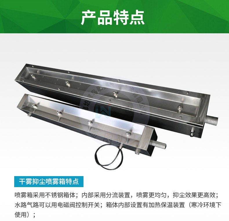 干霧抑塵系統(tǒng)的干霧箱采用304不銹鋼箱體,內(nèi)部采用水路、氣路分流裝置,噴霧更均勻。箱體內(nèi)可設(shè)置加熱保溫裝置。每個(gè)箱體安裝4-8個(gè)干霧噴嘴。