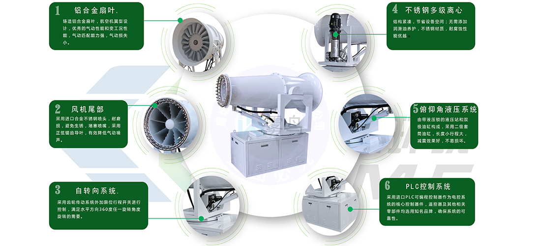 6、功轉(zhuǎn)換效率高、射程遠(yuǎn)、覆蓋面積大、霧粒細(xì)小且均勻、抑塵效果好。水霧與飄在空中的塵埃接觸時(shí),被塵埃所吸附,加大塵埃的比重,抑制塵埃在空氣中的流動(dòng),并加速塵埃沉降,實(shí)現(xiàn)對(duì)空氣的凈化。